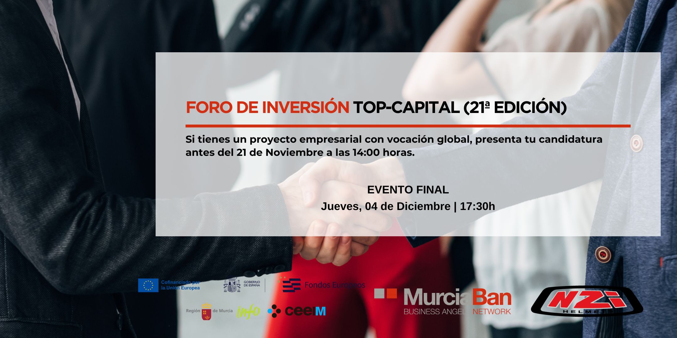 El próximo 4 de diciembre tendrá lugar la 21º edición del Foro de Inversión TOP CAPITAL promovido por Murcia-Ban. La charla inaugural dará paso a la exposición de 5 innovadores proyectos empresariales en formato 5´+5´. El encuentro entre proyectos con gran potencial y capital inteligente es el objetivo primordial de este encuentro. Evento...